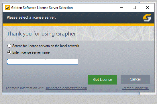 4. Select the License Server option, select “Enter license server name” and enter the server name that will be included for your information on your completed WebStore order. You can find this info by logging into your WebStore account and finding the order in your Order History. Fill in the license server name field with that information and click “Get License”. |